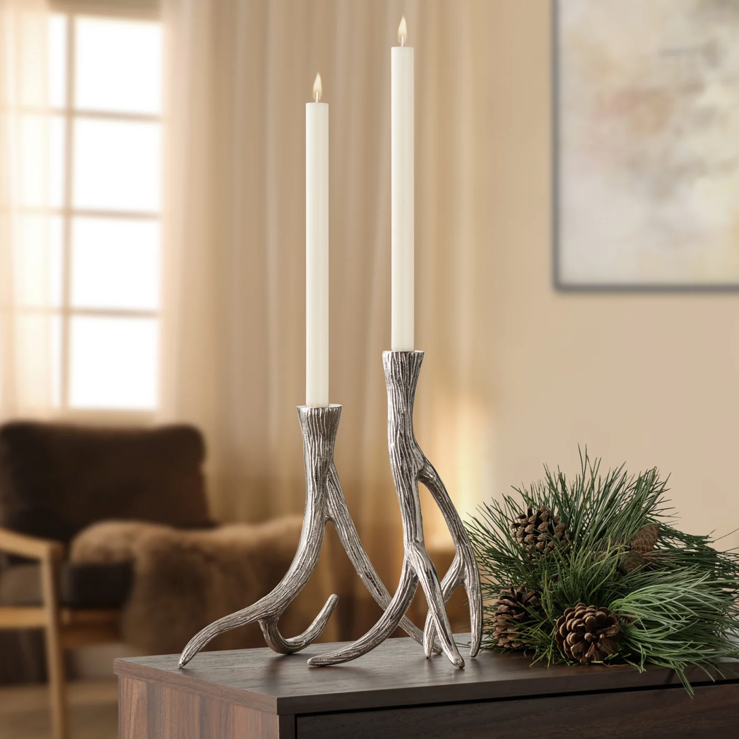 Create the feel of an urban lodge retreat all year round with these antler-inspired aluminum candle holders. The set is designed to be used together, but can also be used on their own.