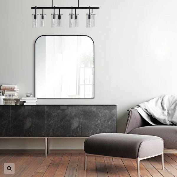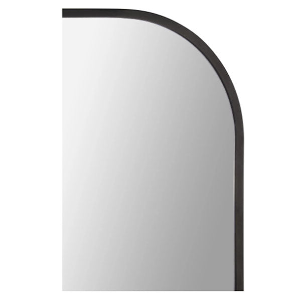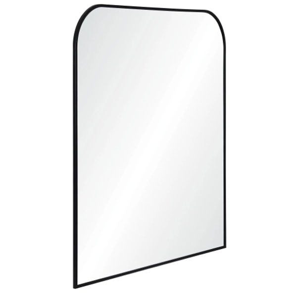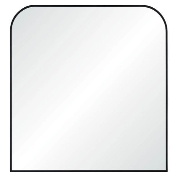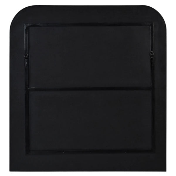 A refined piece that combines traditional design elements with modern aesthetics, its nearly square shape features rounded top corners, adding a designer touch to any space. The iron frame is finished with a powder-coated matte black, offering a timeless look that complements various interior styles. This mirror can be mounted on the wall, providing both functionality and elegance to your decor.