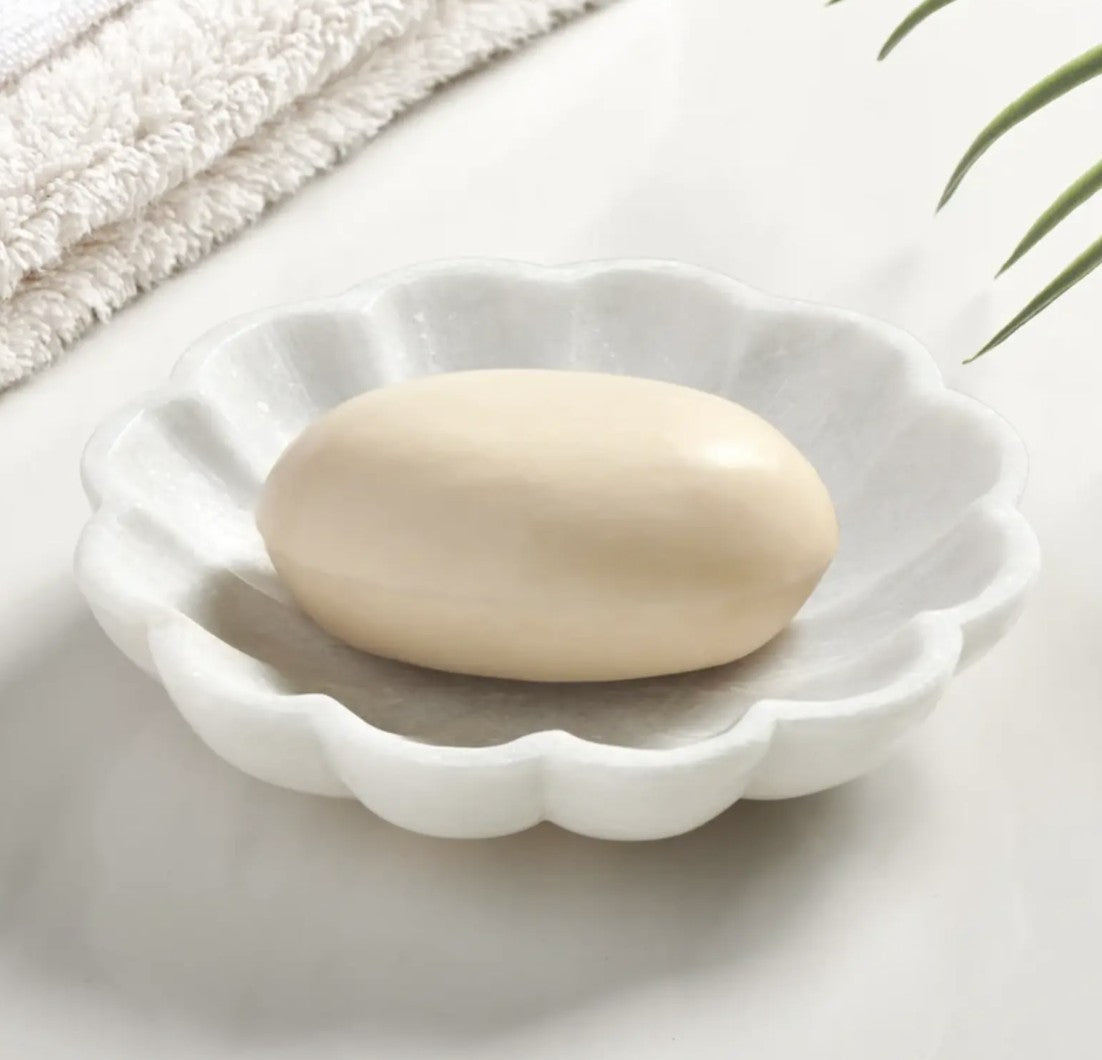 This 6" soap dish is an elegant and versatile accent piece, carved from solid marble into the shape of a delicate blooming flower. Its sculptural form and natural stone veining make it both functional and decorative—perfect for holding soap, storing jewelry, or simply enhancing a vanity, bathroom, or bedside table with a touch of organic luxury. The smooth, cool surface is easy to clean, while the weight and craftsmanship give it a timeless, artisanal feel.