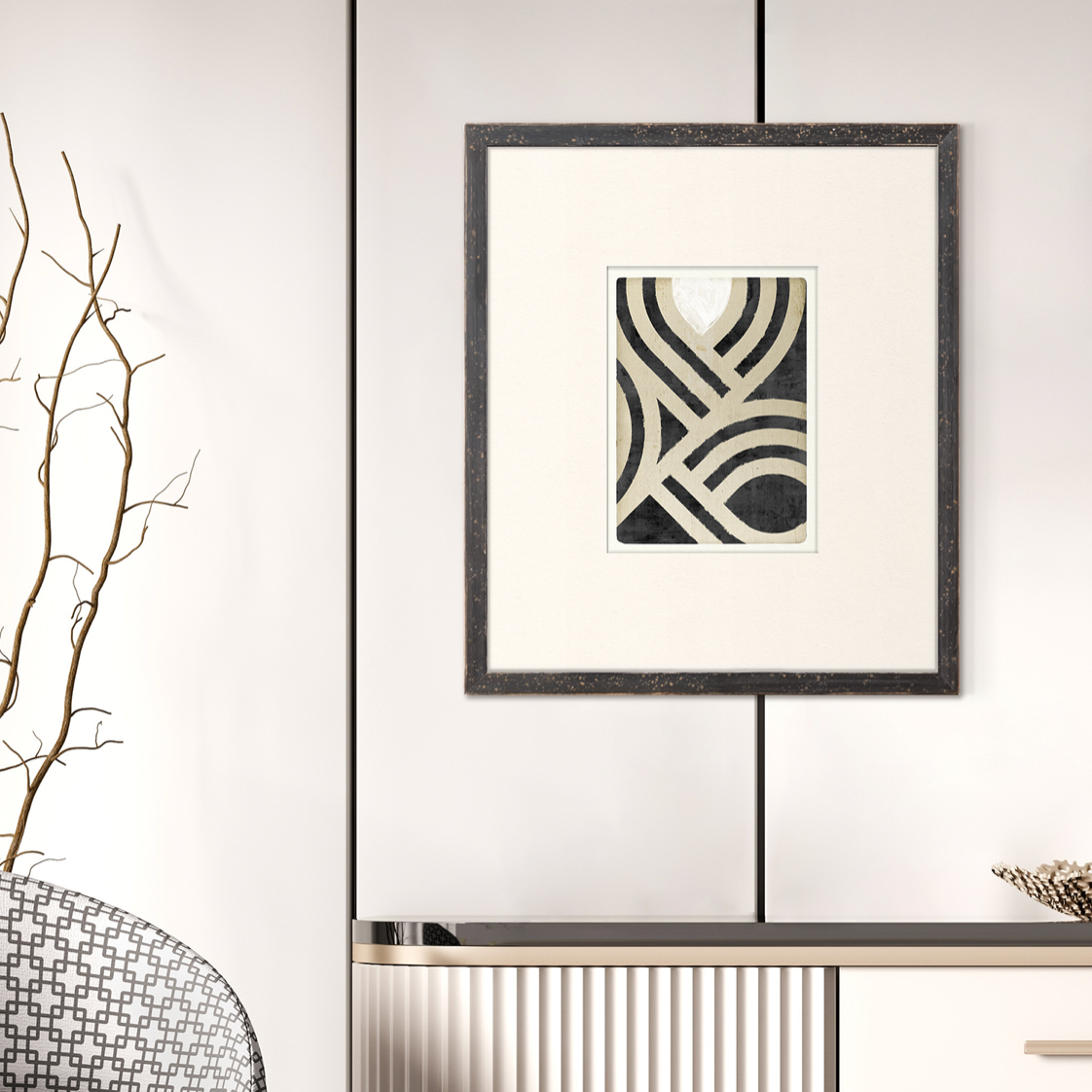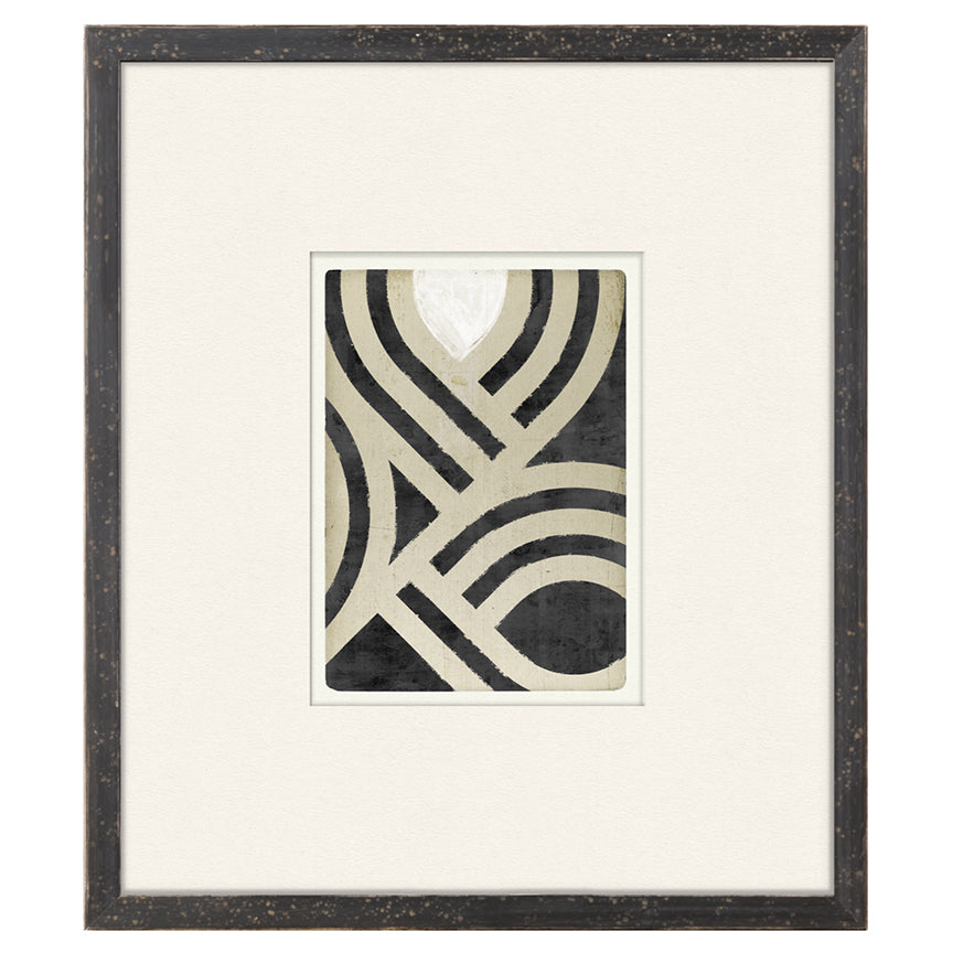 Each of these black and white geometric patterns is created on aged papers with the feel of mid-century graphics. Framed with a wide matte and an antiqued black profile for a collector’s vibe. Use them as a whole or mix them up in your favourite gallery style hanging.