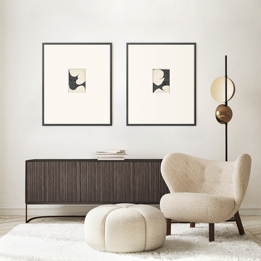 The shapely forms of these four contemporary, minimal compositions are well played out in graphic black and white. Each is framed with pebbled mattes and contrasting rustic charcoal frames. For a bigger punch, a larger, un-matted size is available as well.