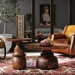 Crafted by the skilled hands of Indian artisans, this table is made from sturdy mango wood. This round side table, with its rustic charm and bold, graceful lines, is finished in a deep, dark walnut that brings out the beauty of the natural grain. The tabletop features a gently sloped edge, while the sturdy base highlights the craftsmanship of its makers.