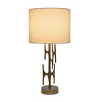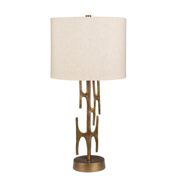 Make a statement on your credenza with this eye-catching table lamp! Blending retro charm with modern flair, its textured antique brass-plated aluminum base adds a touch of timeless style. Topped with a speckled off-white cotton shade, it casts a warm, inviting glow. A three-way switch lets you customize the lighting to suit any mood or setting.